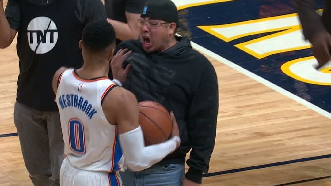 Video of the bizarre confrontation showed the man walk onto the court and scream in Westbrook's face as the Nuggets and fans at the Pepsi Center celebrated the wild aftermath of Gary Harris' game-winning 3-pointer.