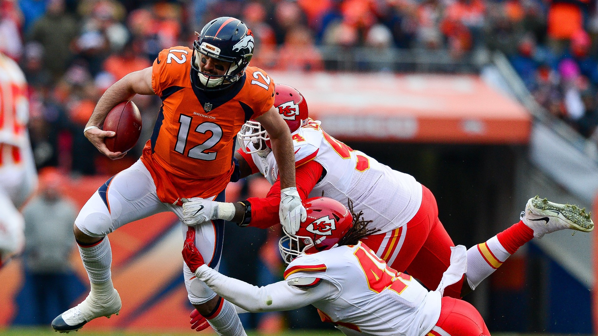 Paxton Lynch scrambles against the Kansas City Chiefs at Sports Authority Field at Mile High on December 31, 2017. Photo by Dustin Bradford/Getty Images.