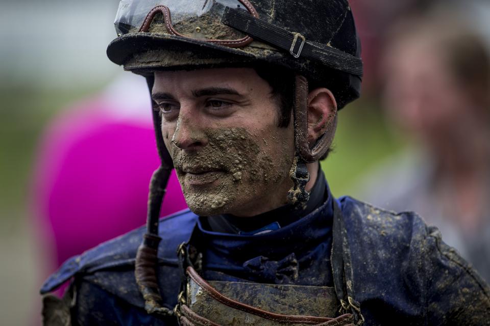 Yesterday's Mud Will Be Today's Mud, Baby: Jockey Sheldon Russell returns to the ready-room after his Black-Eyed Susan Day race at Pimlico on Friday. (Photo by Alex Evers/Eclipse Sportswire/Getty Images)