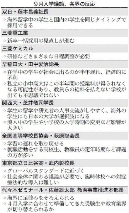 企業の採用活動も依然として春に集中する。9月入学・夏卒業に移行するなら「企業も本格的に通年採用に切り替える必要がある」(経団連幹部)。一括で筆記試験や面接を実施する方式は学業の妨げとなることもあり、単純に採用時期を秋にずらすのではなく「一斉入社をやめて多様化を図るべきだ」(経済同友会幹部)との声もある。