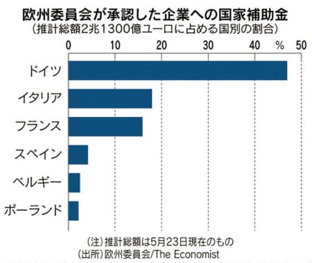 スペインなど一部の加盟国は既に、今のような政府支援を際限なく認めるなら単一市場の存続は難しくなると不満を表明している。一部の豊かな国だけが自国の産業や企業に多額の資金を投じているからだ。EU全体で提供された国家補助金の約半分は独政府による。ドイツは豊かな大国で、コロナ危機に突入した時点の公的債務も他国より少ない。規模が小さく、財政が苦しい国々は、自国企業にこれほどに手厚い支援を提供できずにいるだけに、他国の企業にのみ込まれるのではないかと懸念を募らせている。
